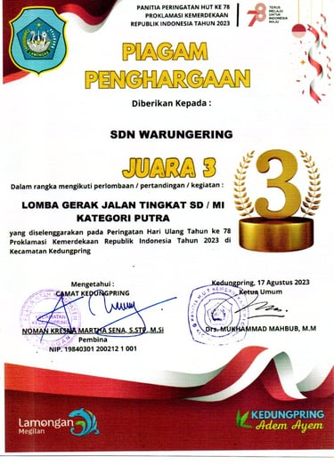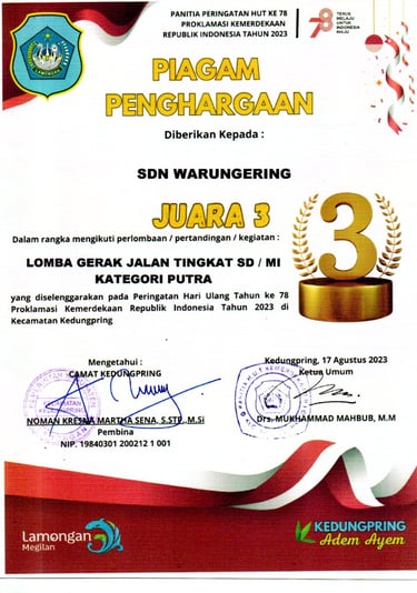 Pada ajang bergengsi tersebut, tim gerak jalan kategori putra dari SD Negeri Warungering berhasil meraih Juara 3. Lomba gerak jalan ini diselenggarakan sebagai salah satu bentuk kegiatan peringatan hari kemerdekaan RI yang bertujuan untuk menanamkan nilai disiplin, kerja sama, dan cinta tanah air kepada para siswa. Setiap tim menampilkan barisan yang rapi, gerakan yang kompak, serta semangat yang tinggi selama kegiatan berlangsung.